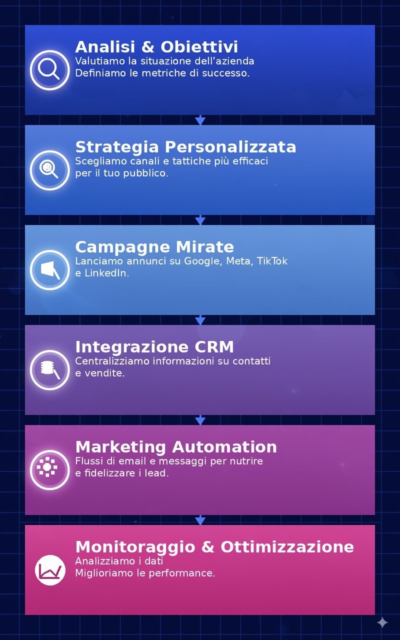 Ogni progetto inizia con una profonda analisi dell’azienda, prosegue con la definizione di una strategia su misura e si sviluppa attraverso campagne pubblicitarie mirate su Google, Meta, TikTok e LinkedIn. Integrando i dati di lead e vendite nel CRM e utilizzando automazioni via email e messaggistica istantanea, otteniamo risultati concreti e misurabili.